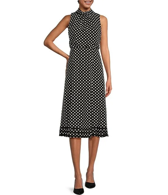 Mock Neckline Sleeveless Polka Dot Midi Dress