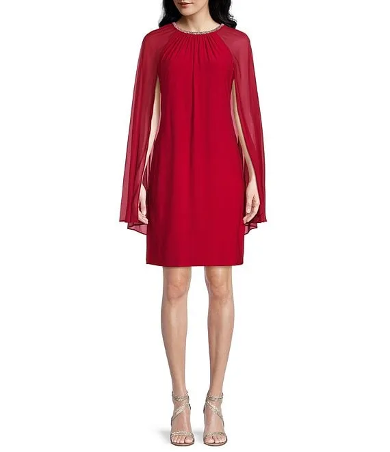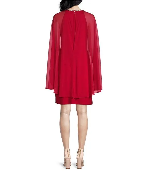 Crew Neck Long Capelet Sleeve Rhinestone Trim Chiffon Dress