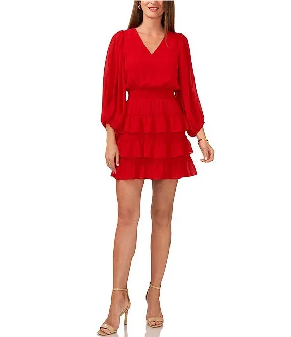 V-Neck Long Balloon Sleeve Smocked Waist Tiered A-Line Chiffon Mini Dress
