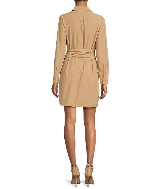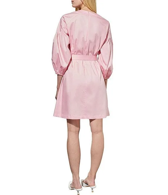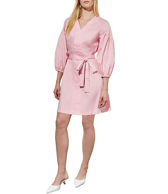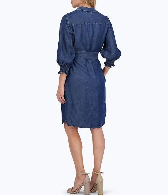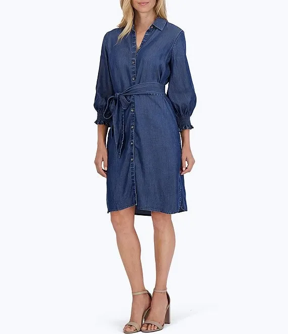 Abby Woven Tencel Point Collar 3/4 Smocked Ruffle Cuff Sleeve Belted Button Front Shirt Dress
