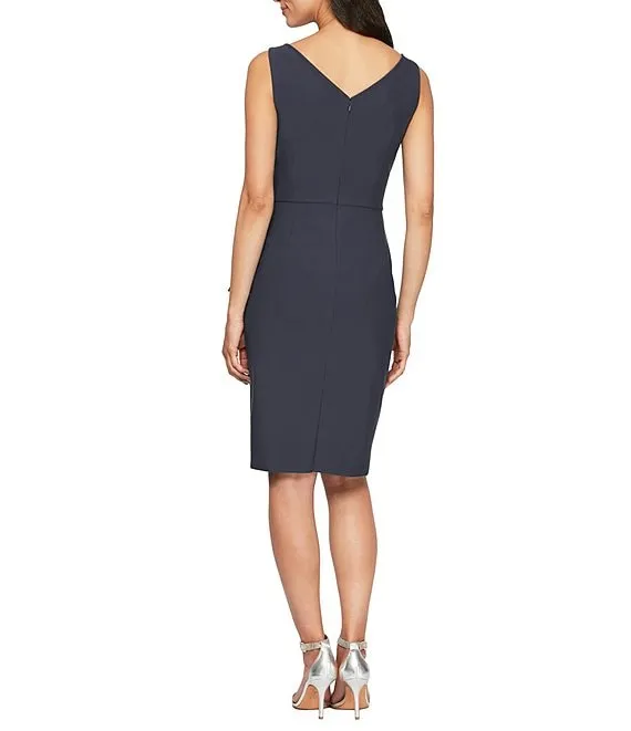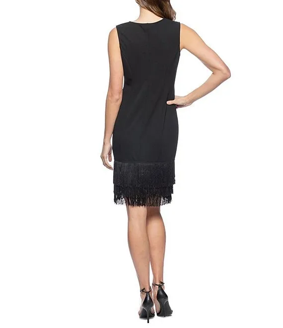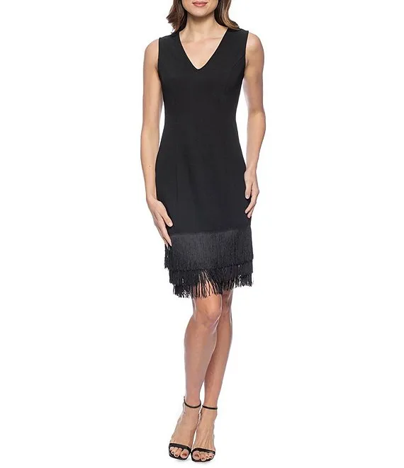 Sleeveless V-Neck Fringe Hem Scuba Crepe Short Sheath Dress
