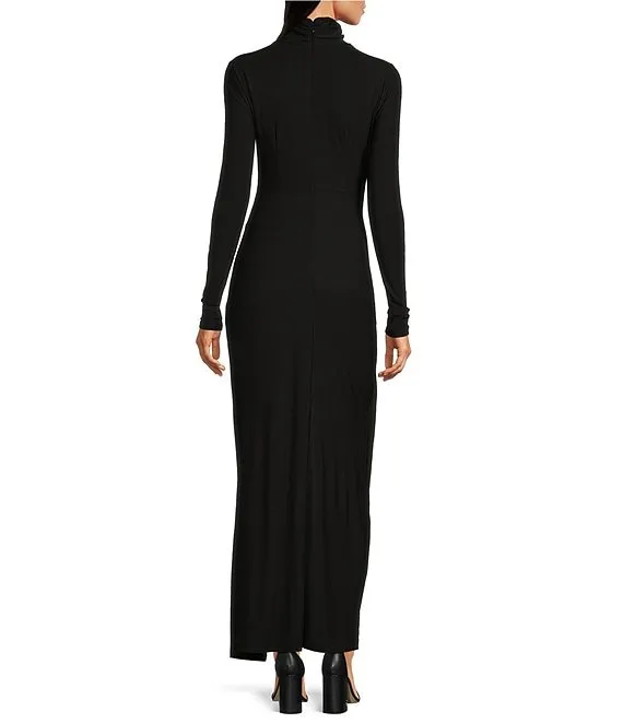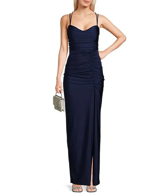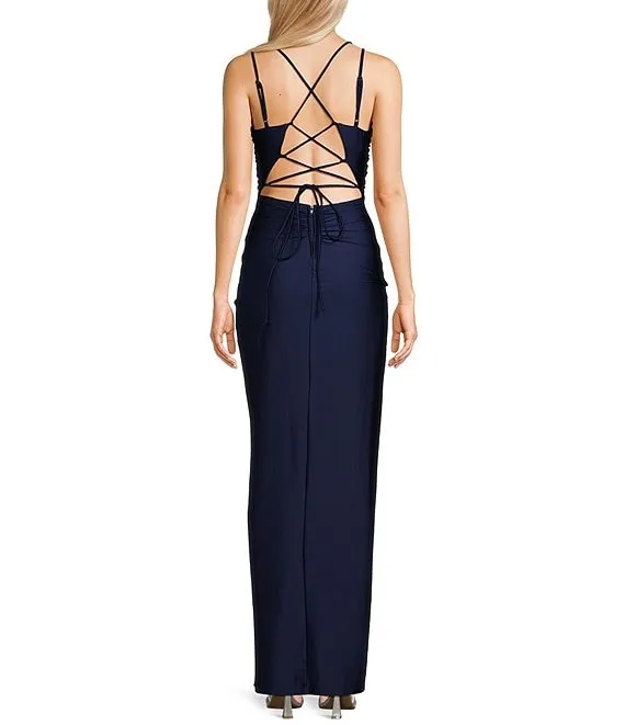 Cowl Neck Lace-Up Back Front Slit Long Dress