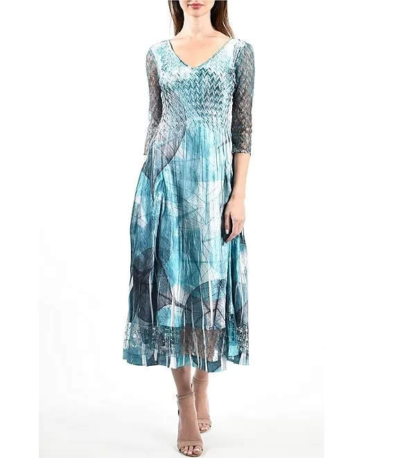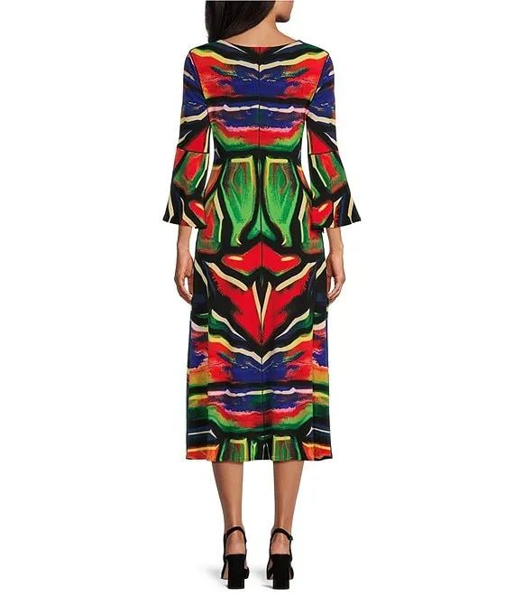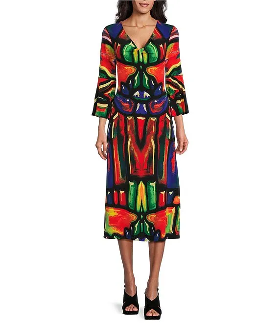Eva Varro Knit Jersey Colorful Stained Glass V-Neck 3/4 Bell Sleeve A-Line Midi Dress