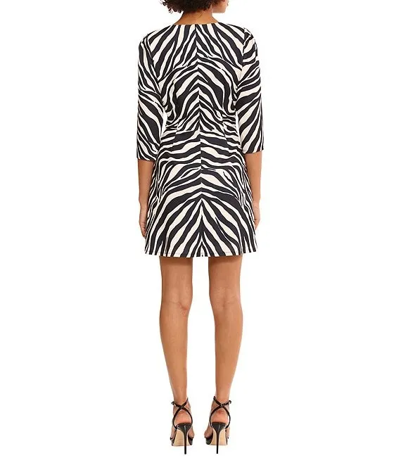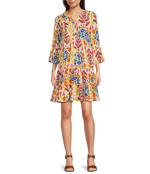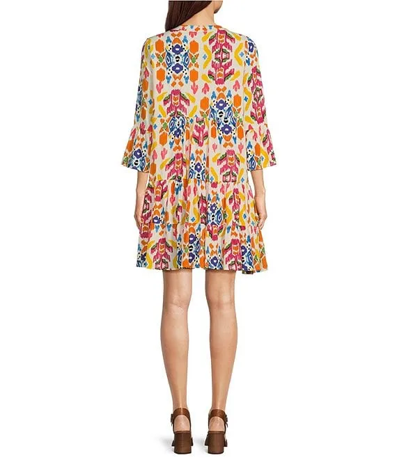 Abstract Print Banded Split V-Neck Button Front 3/4 Sleeve Straight Hem Dress