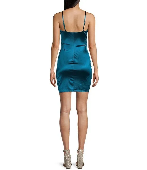 Square Neck Shirred Side Faux Wrap Mini Dress