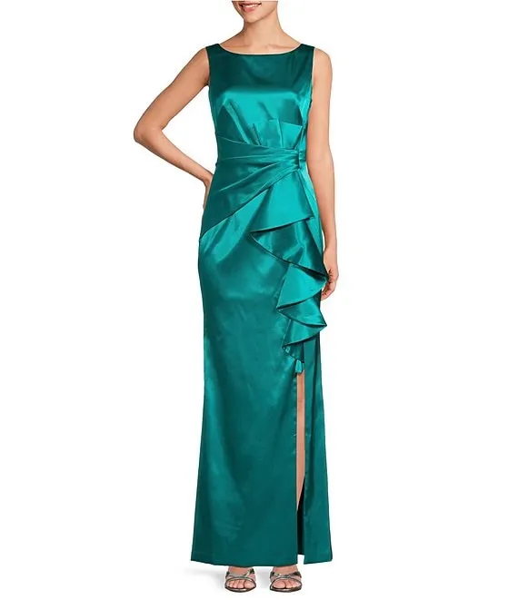 Stretch Satin Boat Neck Sleeveless Cascading Ruffle Side Slit Gown