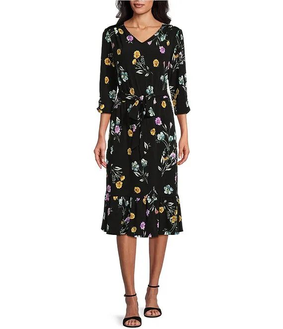 Floral Print 3/4 Ruched Sleeves V-Neck Ruffle Hem A-Line Midi Dress