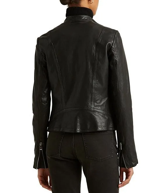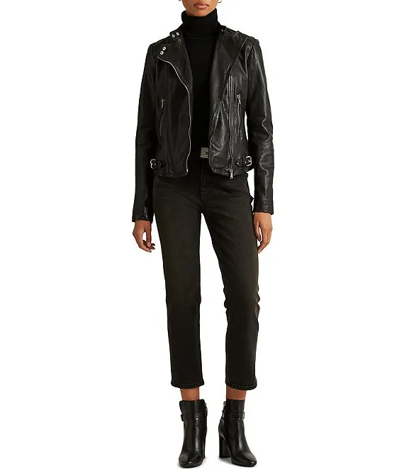 Lambskin Biker Jacket A burnished finish enhances the rich hue of this lambskin biker jacket that’s finished with “LRL”-engraved metal hardware.