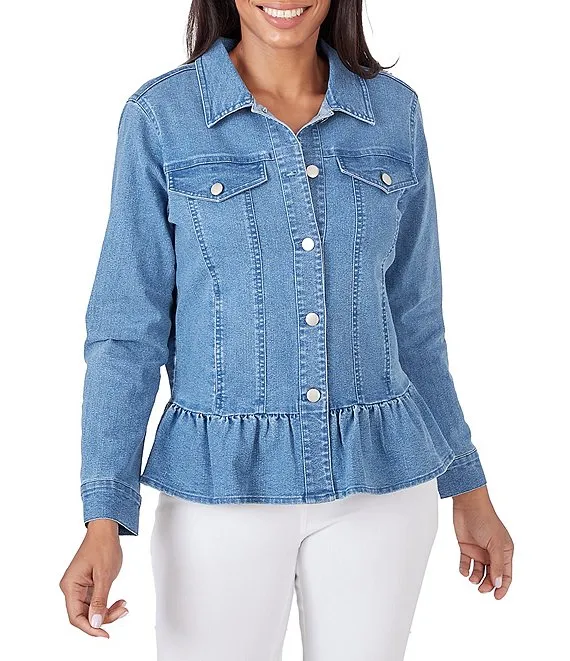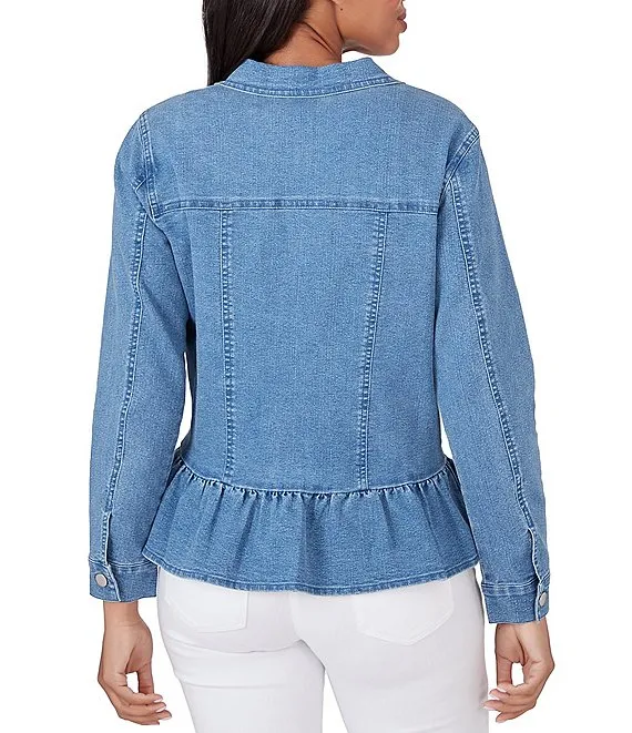 Stretch Denim Flap Pocket Ruffle Peplum Hem Jean Jacket
