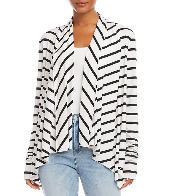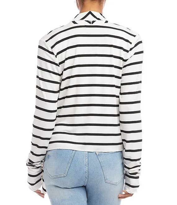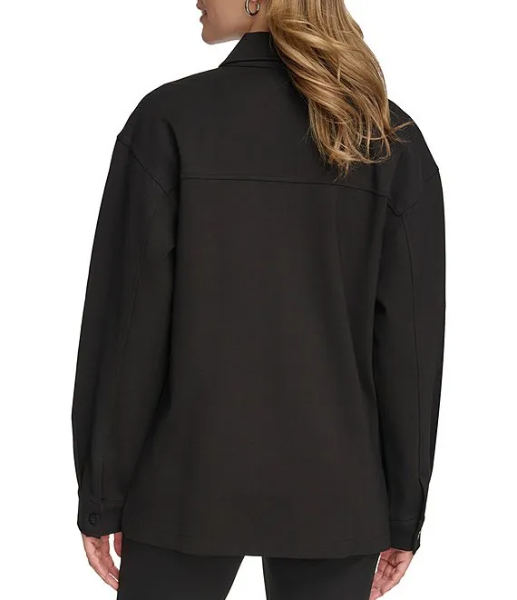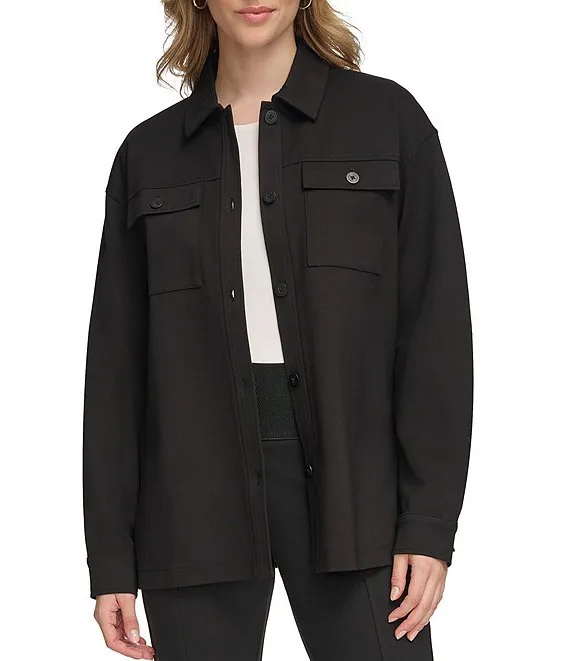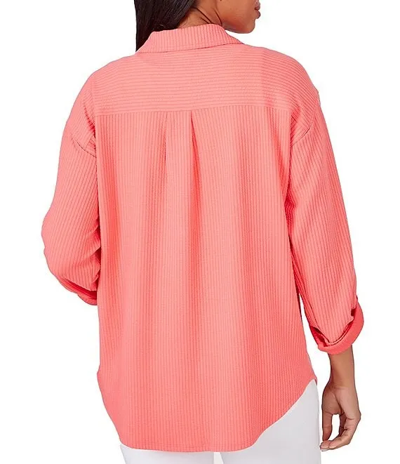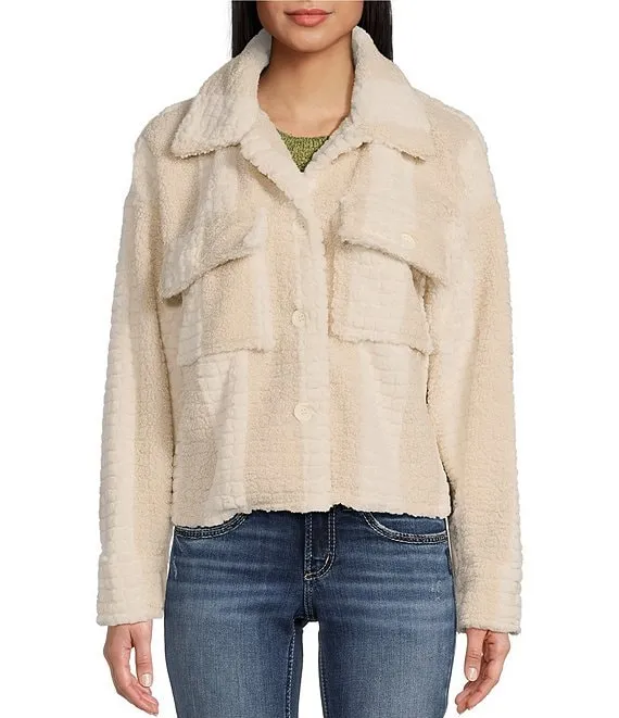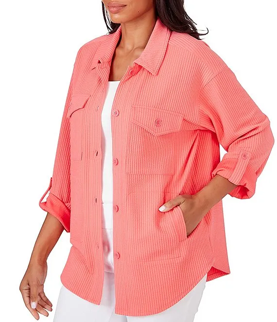 Stripe Ottoman Knit Point Collar Roll-Tab Sleeve Patch Pocket Button-Front Shirt Jacket