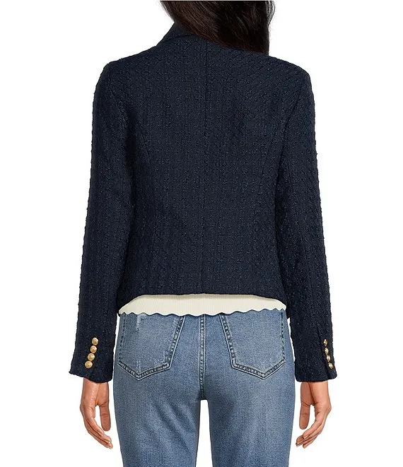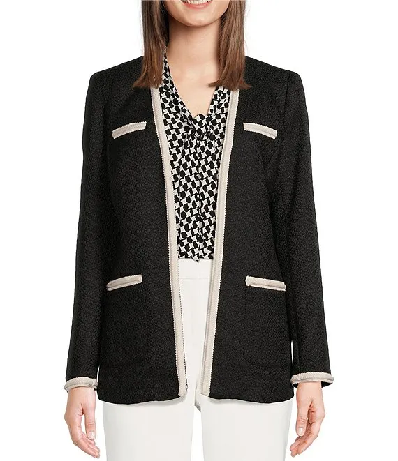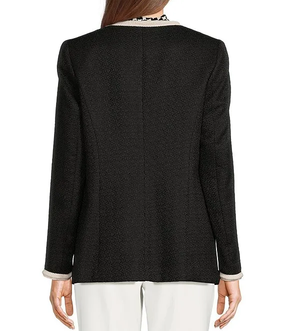 Textured Tweed Four Kissing Woven V-Neck Long Sleeve Contrast Trim Jacket