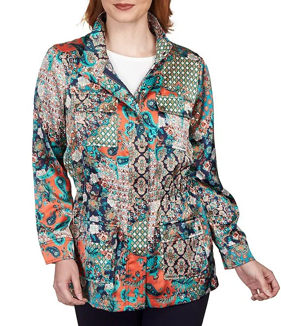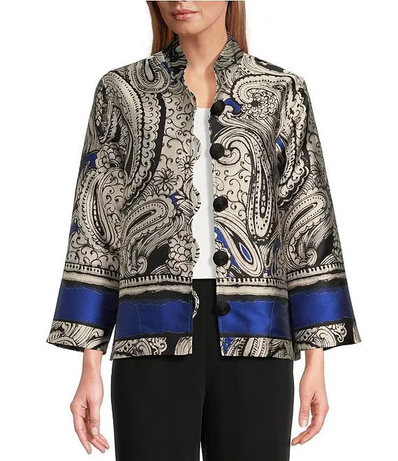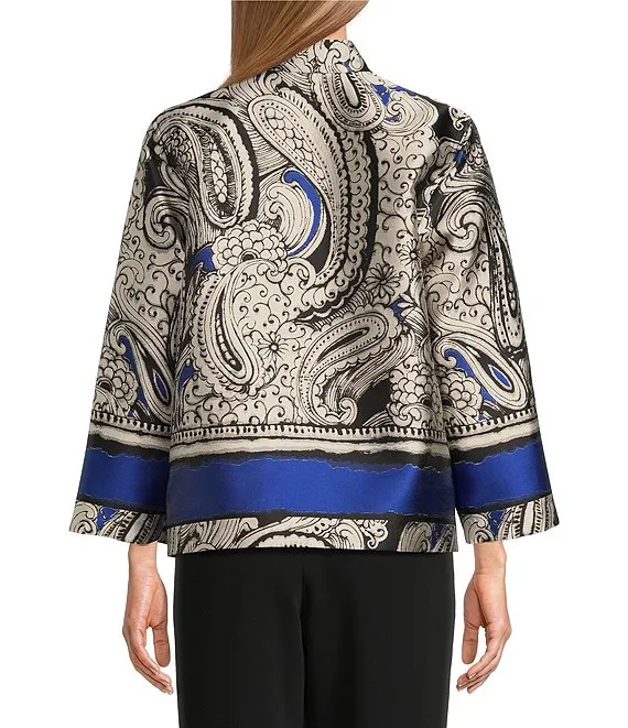 Royal Paisley Print Jacquard Stand Collar 3/4 Sleeve Button Front Statement Jacket