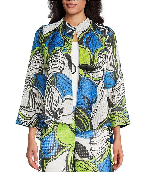 Woven Mesh Abstract Print High Round Neck Bracelet Length Sleeve Asymmetric One Button-Front Jacket