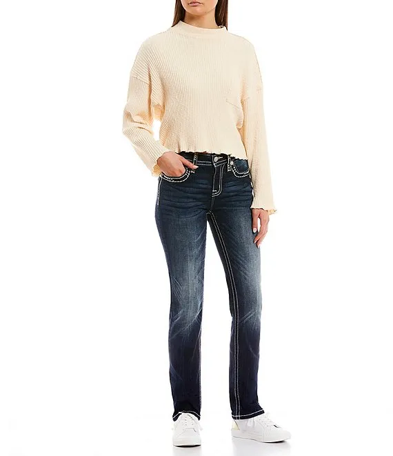 Mid Rise Stitched Flap Pocket Straight Jeans