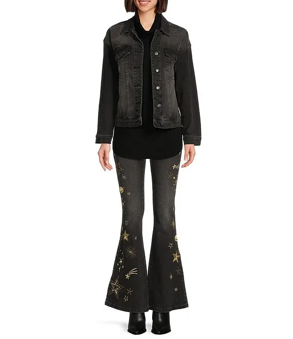 Stretch Gold Shooting Star Embroidered Farrah Flare Jeans