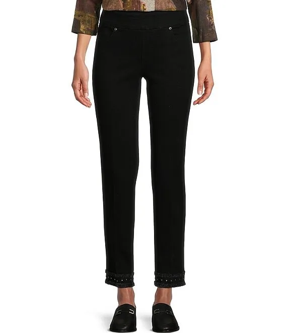 Solid Stretch Denim Straight Leg Embellished Fringe Hem Pull-On Jeans