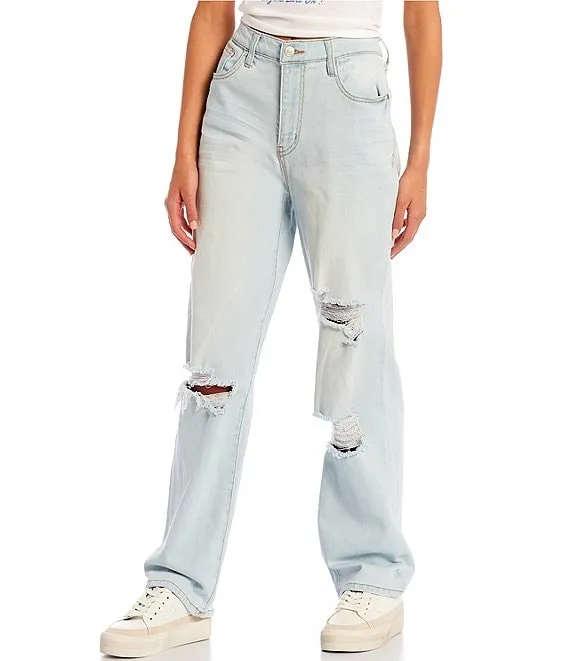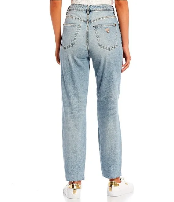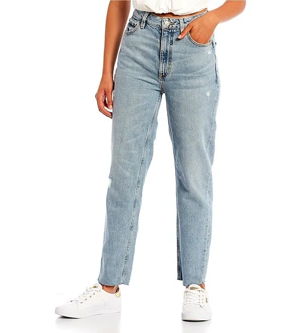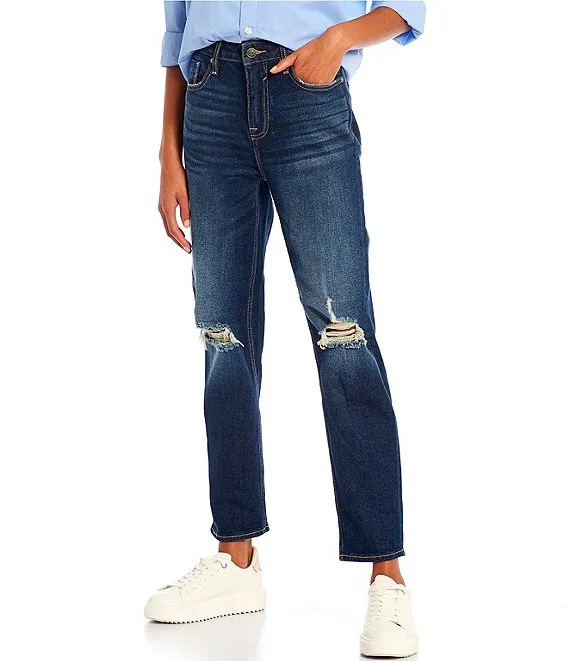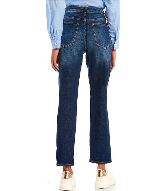 Exposed Button High Rise Distressed Slim Straight Leg Jeans