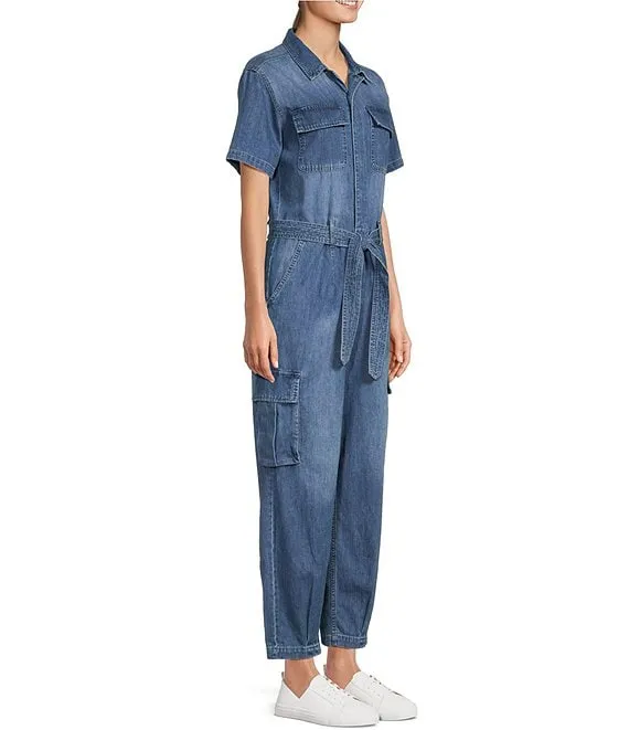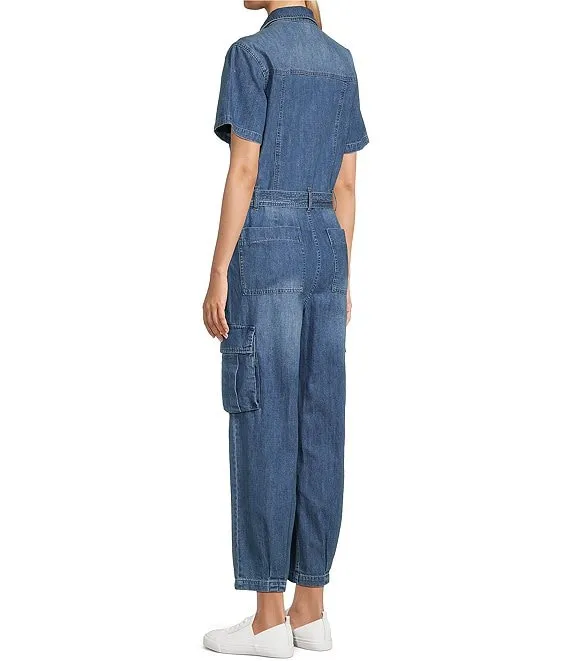 Denim Collared Neckline Short Sleeve Cropped Cargo Jumpsuit