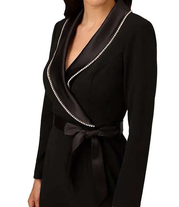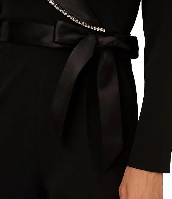 Adrianna Papell Petite Size Long Sleeve V-Neck Tuxedo Crystal Trim Tie Waist Jumpsuit