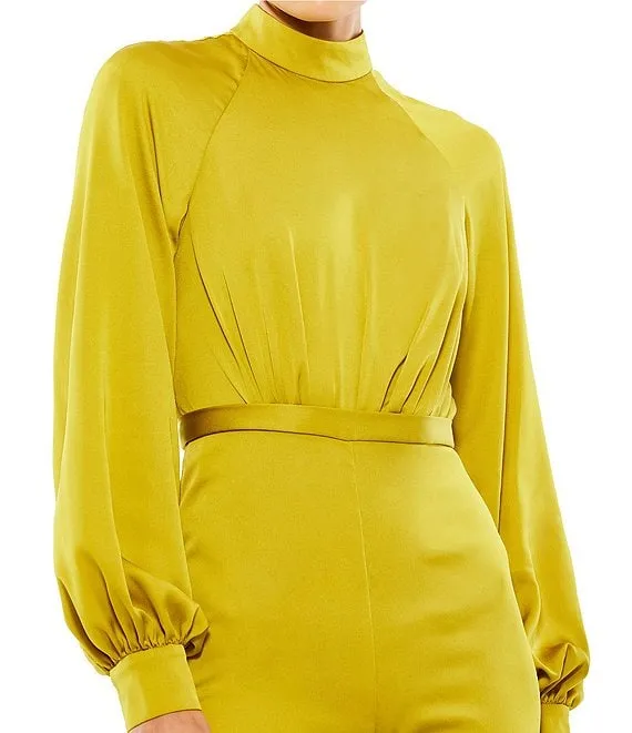 Mac Duggal Satin Raglan Long Sleeve Mock Neck Flared Leg Jumpsuit