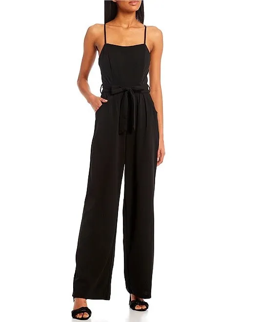 Square Neck Lace Back Waist Tie Jumpsuit