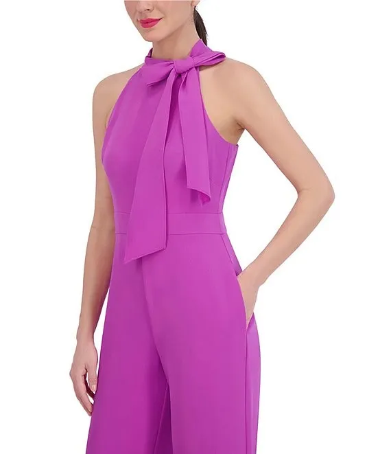 Stretch Crepe Bow Halter Neck Sleeveless Side Pocket Wide Leg Jumpsuit