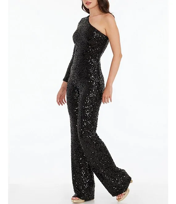 Stretch Sequin One Shoulder Long Sleeve Wide Leg Jumpsuit