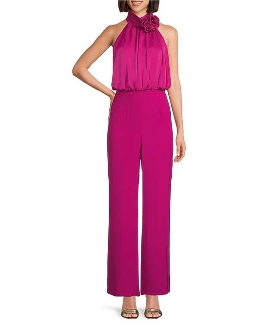 Satin Rosette Embellished Mock Neck Sleeveless Blouson Jumpsuit