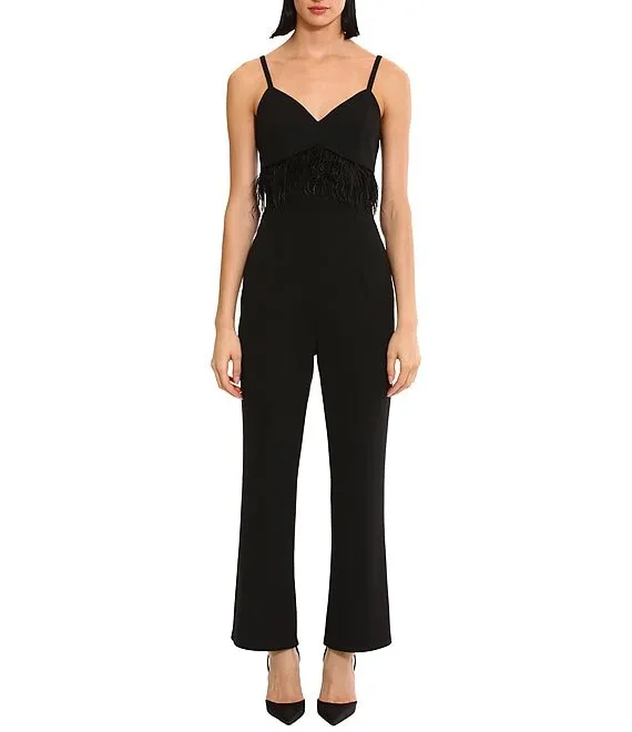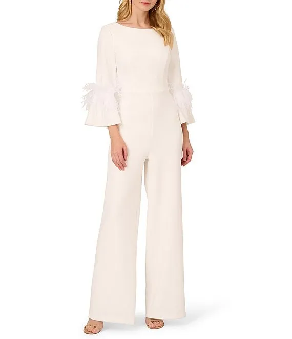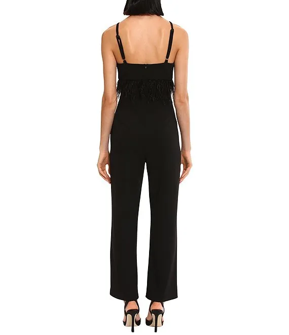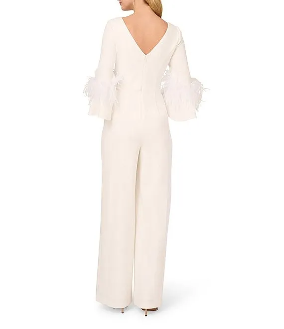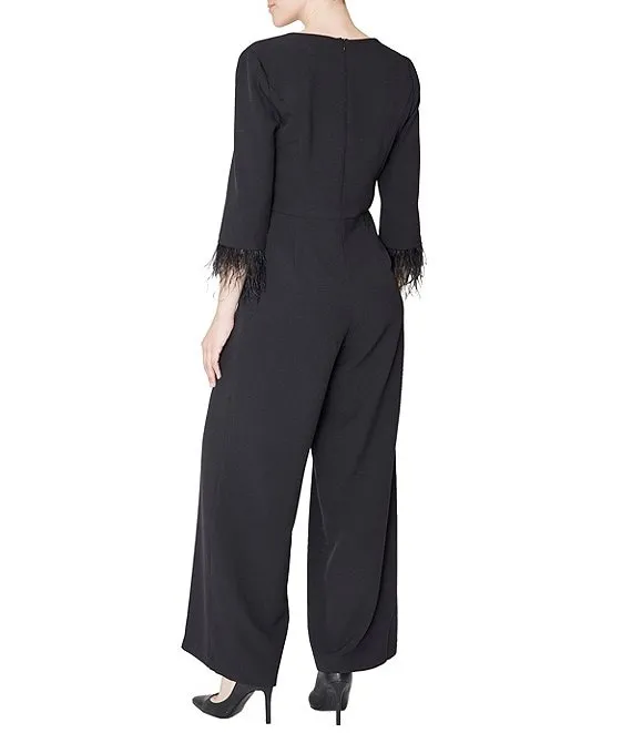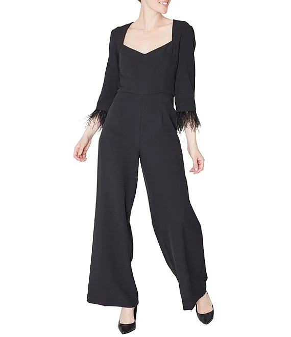 Stretch Crepe Sweetheart Neck 3/4 Sleeve Feather Trim Jumpsuit