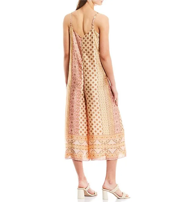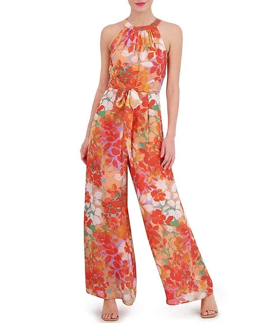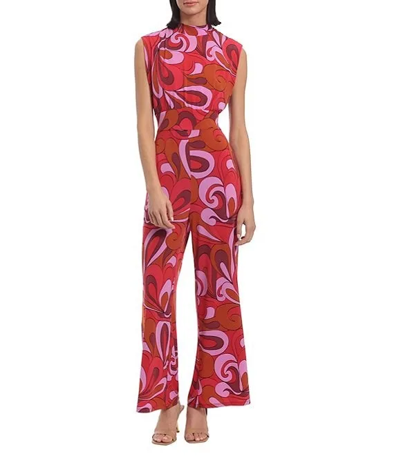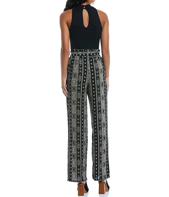 Printed Stretch Mock Neck Keyhole Tie Back Sleeveless Jumpsuit