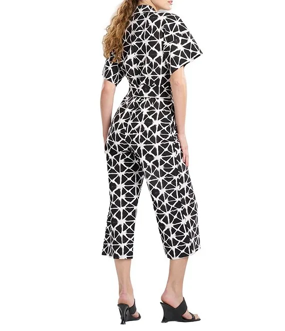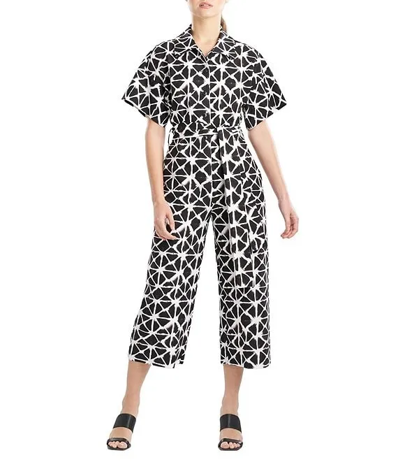 N by Natori Geometric Print Stretch Point Collar Short Sleeve Tie Waist Side Pocket Button-Front Cropped Jumpsuit