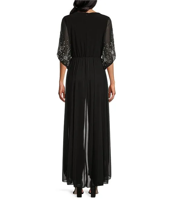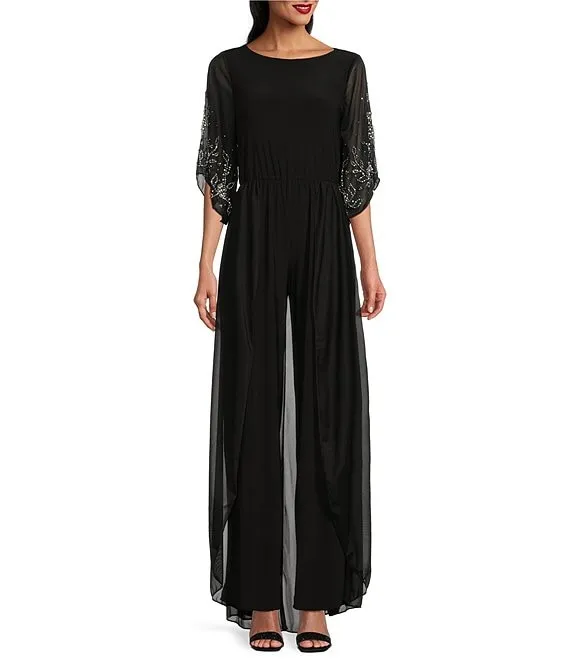 Beaded 3/4 Sleeve Crew Neck Flyaway Jumpsuit