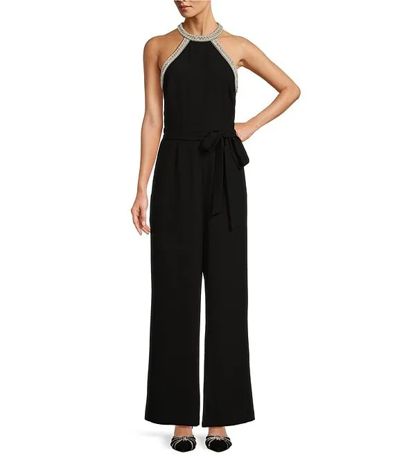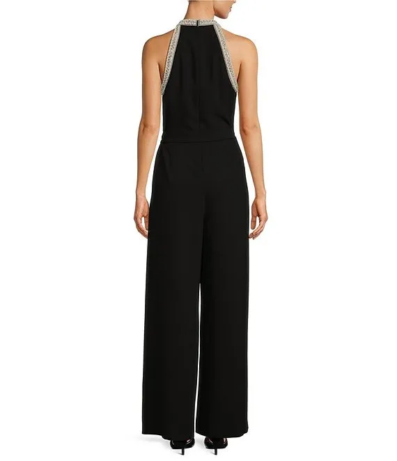 Viola Crepe Halter Beaded Pearl Neckline Wide Leg Jumpsuit