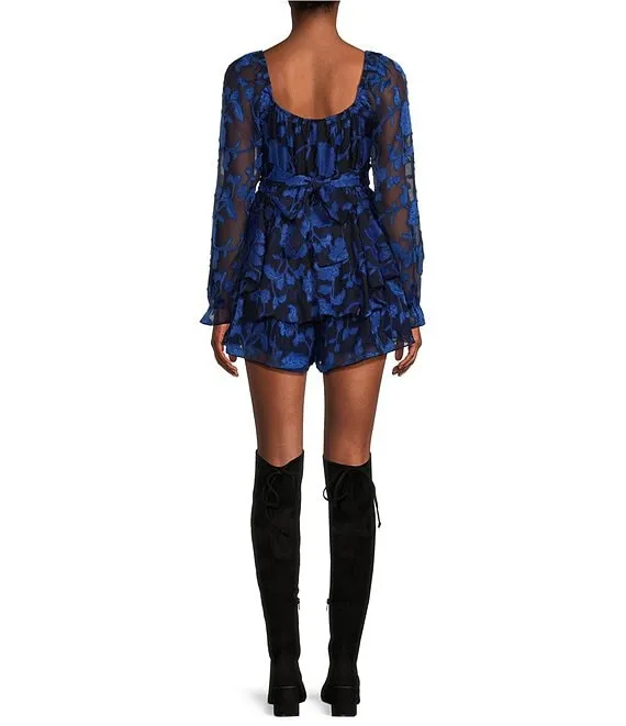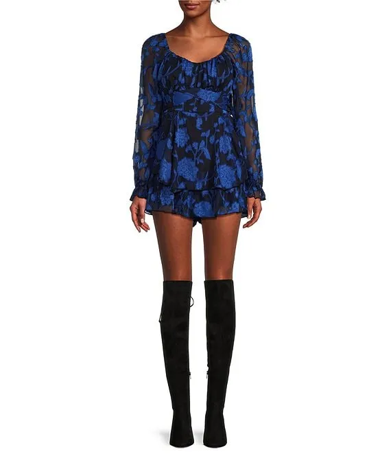 Floral Print Long Sleeve Double Hem Fit-And-Flare Romper