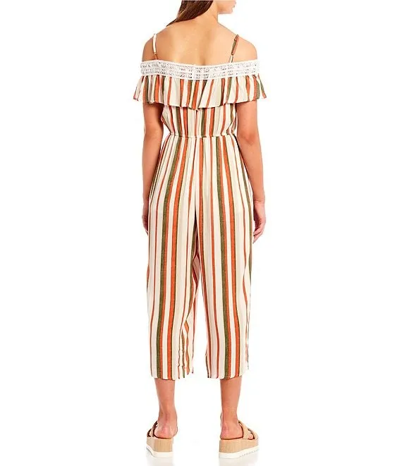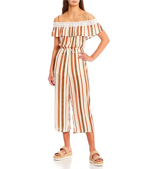 Crochet Trimmed Off-The-Shoulder Ruffle Striped Jumpsuit