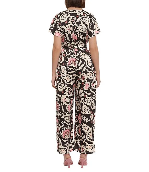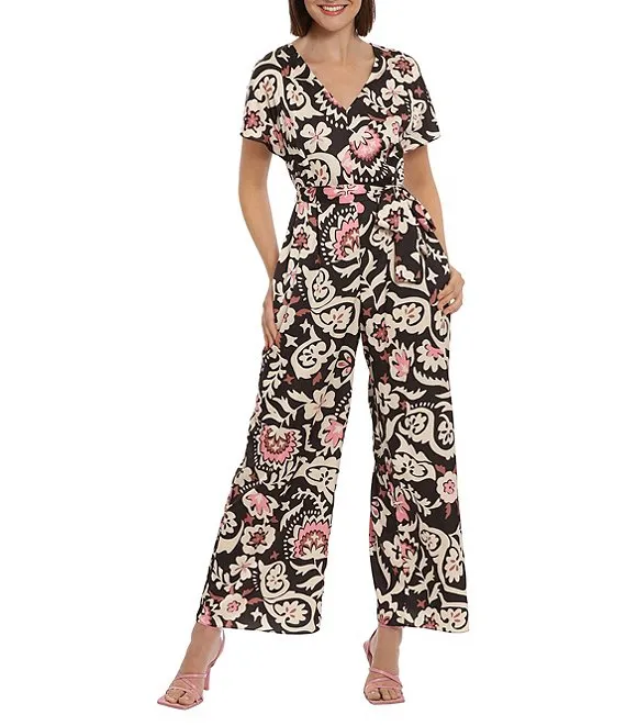 Stretch Paisley Print V-Neck Short Sleeve Jumpsuit