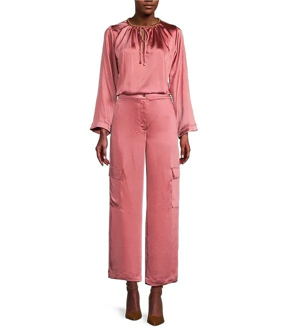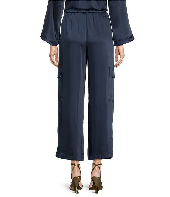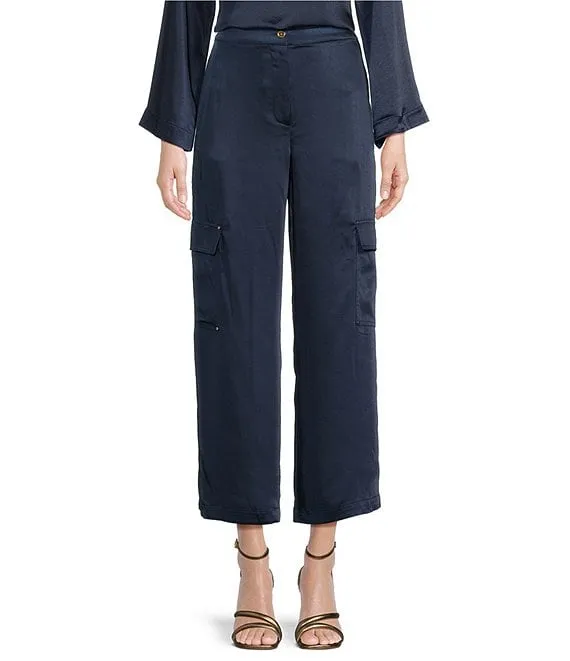 • MICHAEL Michael Kors Solid Crinkle Satin Woven High Rise Patch Pocket Wide Leg Coordinating Cargo Pant