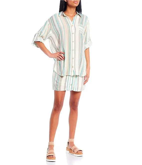 Coordinating Stripe Print Twist Front Button Mini Skirt
