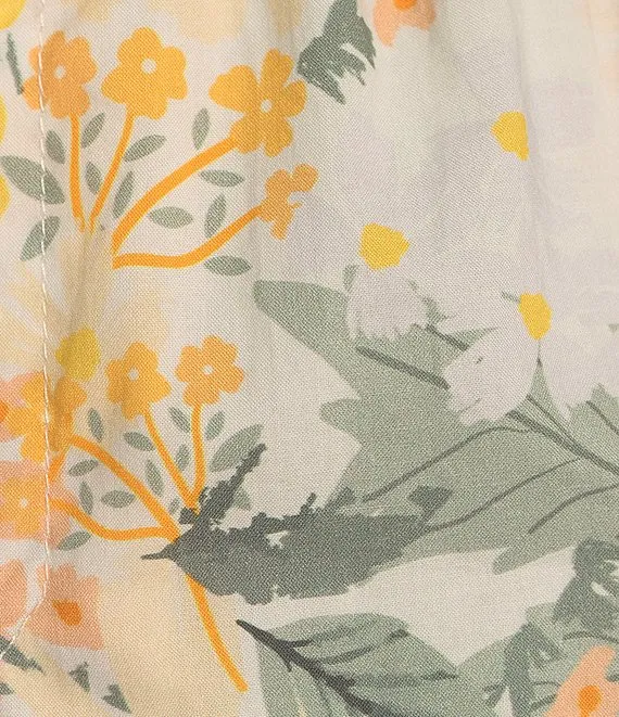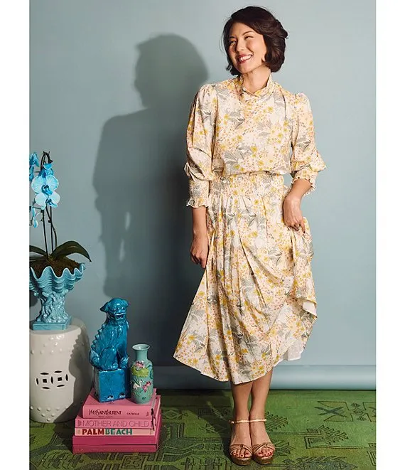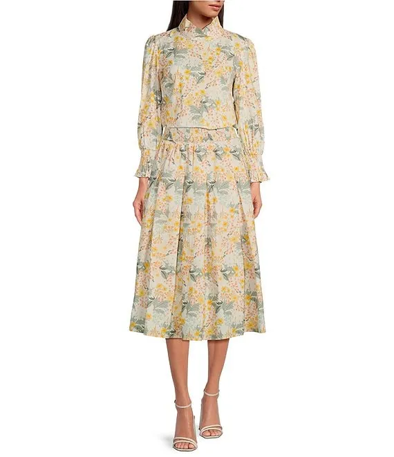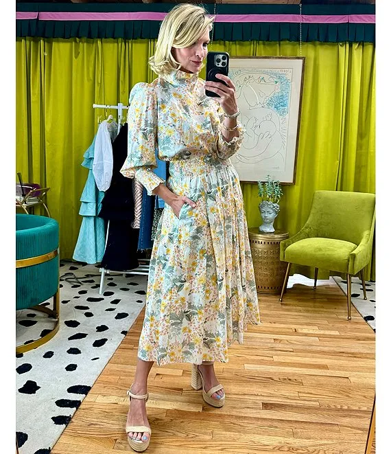 Floral Smocked Waist Pull-On Pocketed A-Line Coordinating Midi Skirt