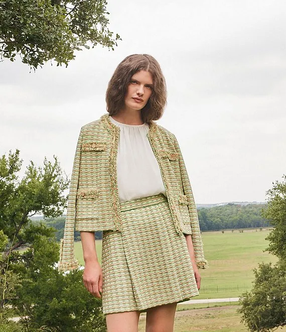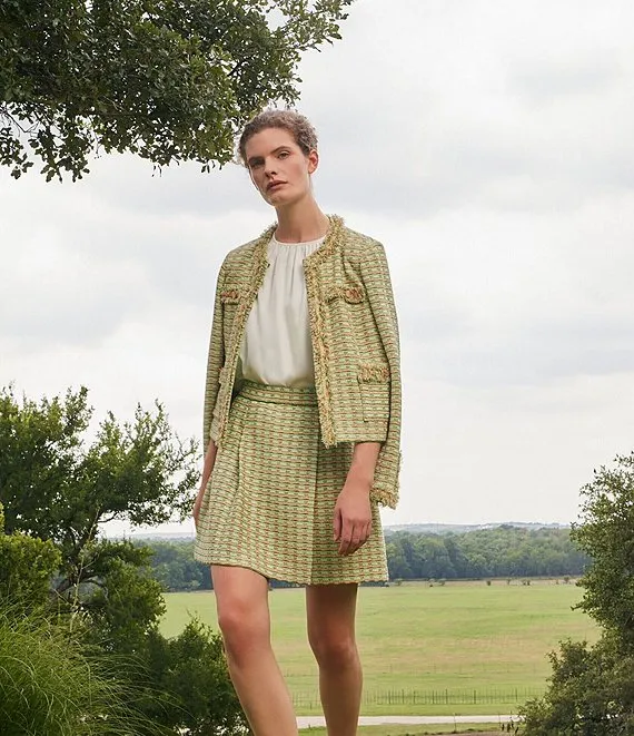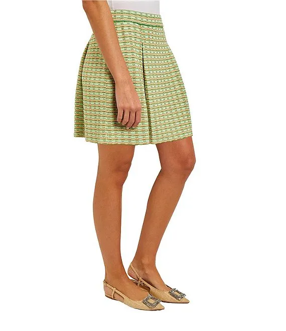 Tweed Knit Printed Inverted-Pleated Pull-On Mini Skirt