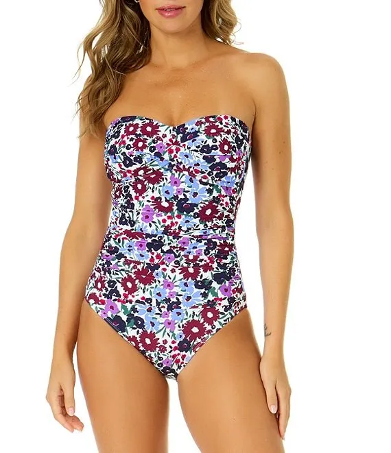 Meadow Bouquet Ditsy Floral Print Strapless Twist Front Bandeau Ruched One Piece Swimsuit