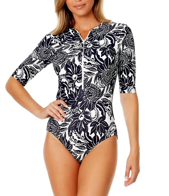 Midnight Floral Print High Neck Elbow Sleeve Zip Front One Piece Swimsuit