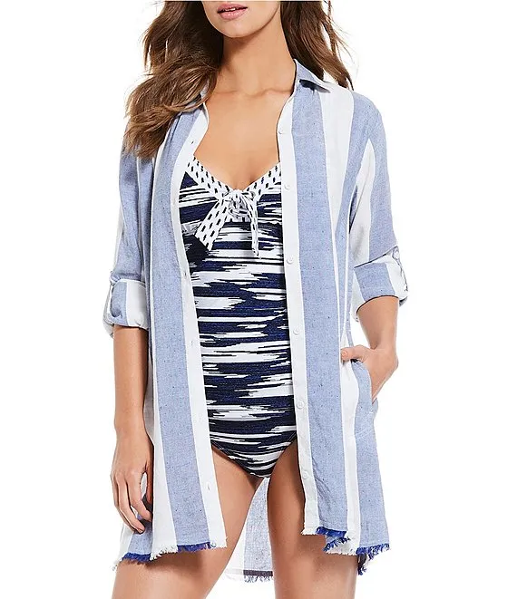Rugby Beach Striped Print Boyfriend Cover-Up Shirt