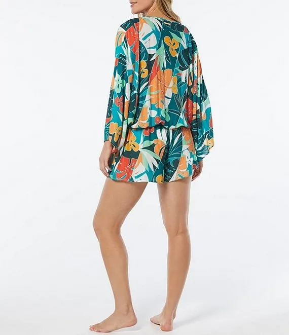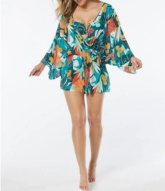 Floral Print Surplice V-Neck Kimono Sleeve Cover-Up Romper