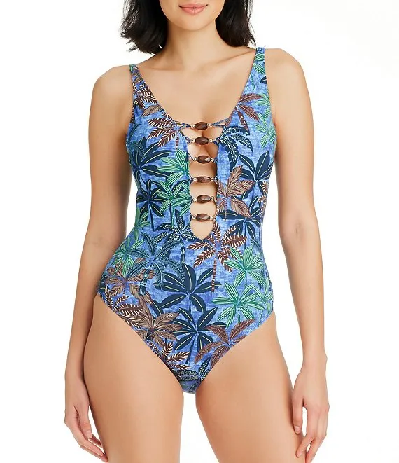 Bleu Rod Beattie By The Sea Beaded Lace Down Printed Plunge Neck One Piece Swimsuit
