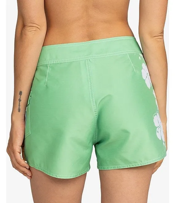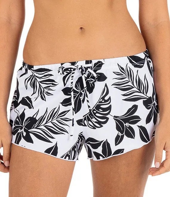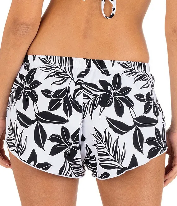 Hibiscus Block Mixed Floral Print Ribbed Elastic Waist Lettuce Hem Board Shorts
