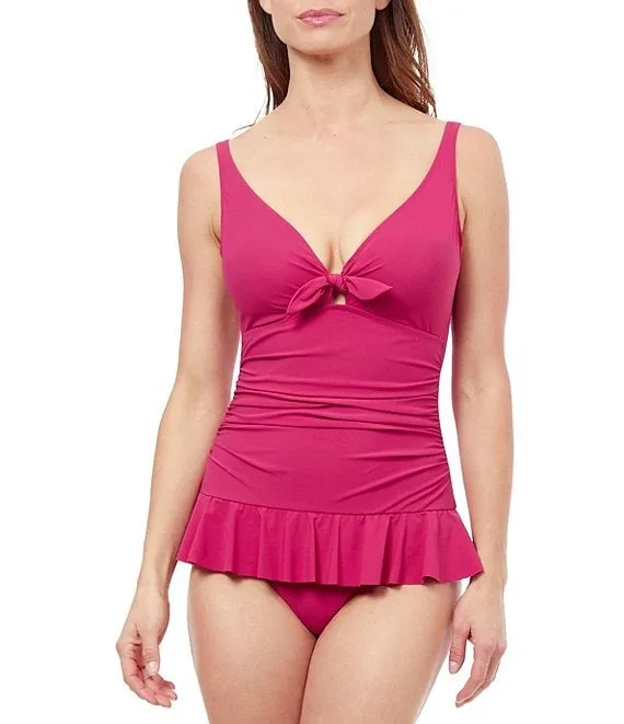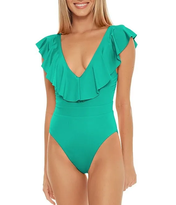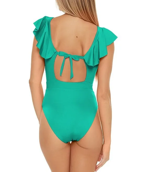 Monaco Solid Ruffle Plunge V-Neck One Piece Swimsuit