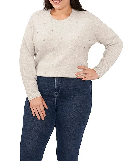 Plus Size Crew Neck Drop Shoulder Long Sleeve Rhinestone Jersey Knit Sweater