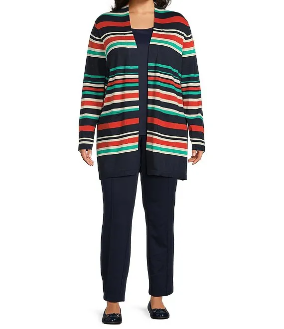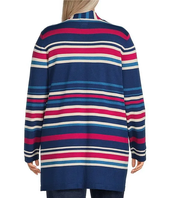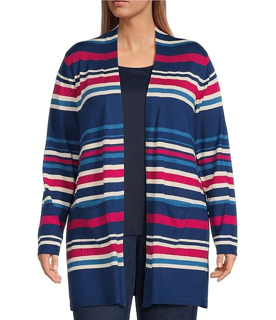 Plus Size Striped Open-Front Pocket Cardigan