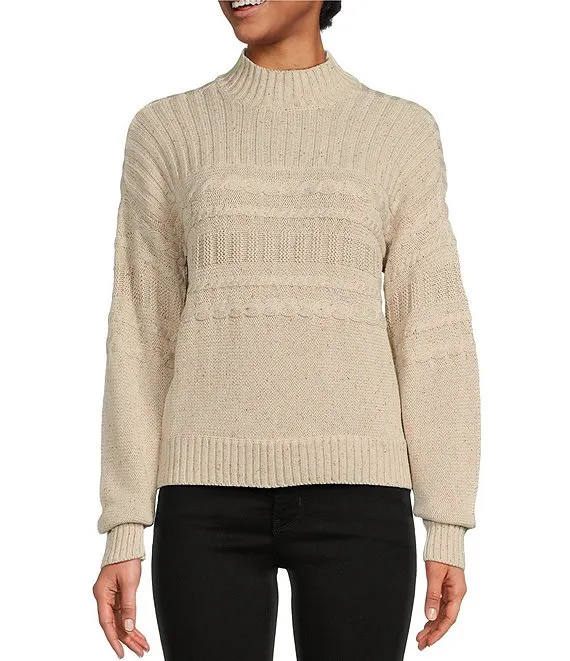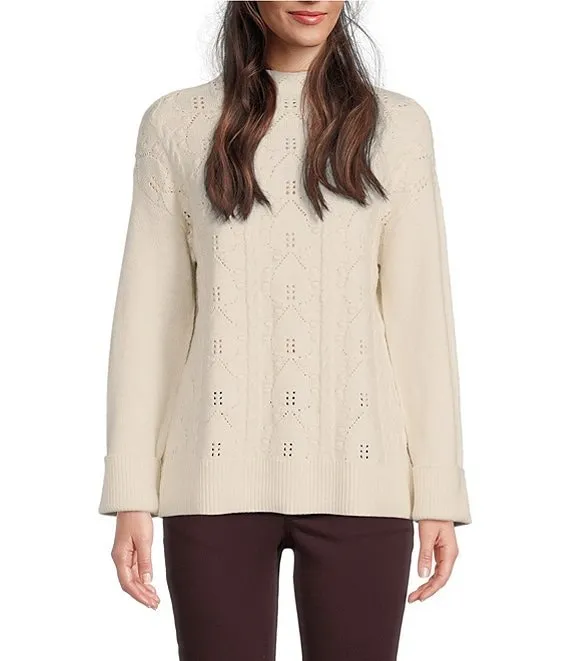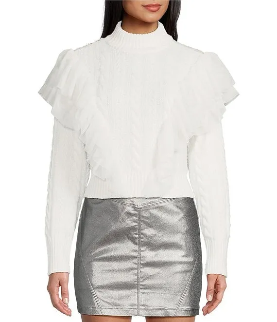 Cable Knit Ruffled Tulle Mock Neck Sweater